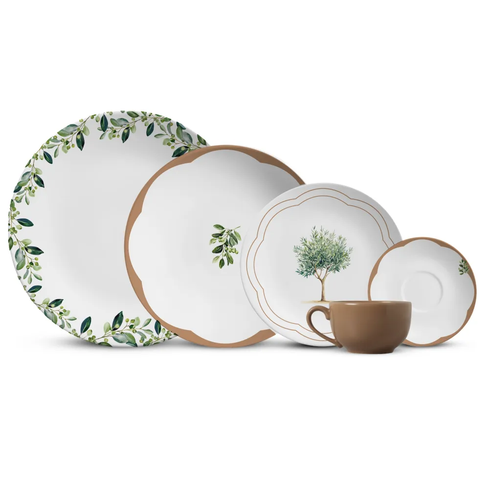 Com ilustrações botânicas de ramos de oliveira, este aparelho de jantar traz tons suaves e formas delicadas que criam composições elegantes e acolhedoras.