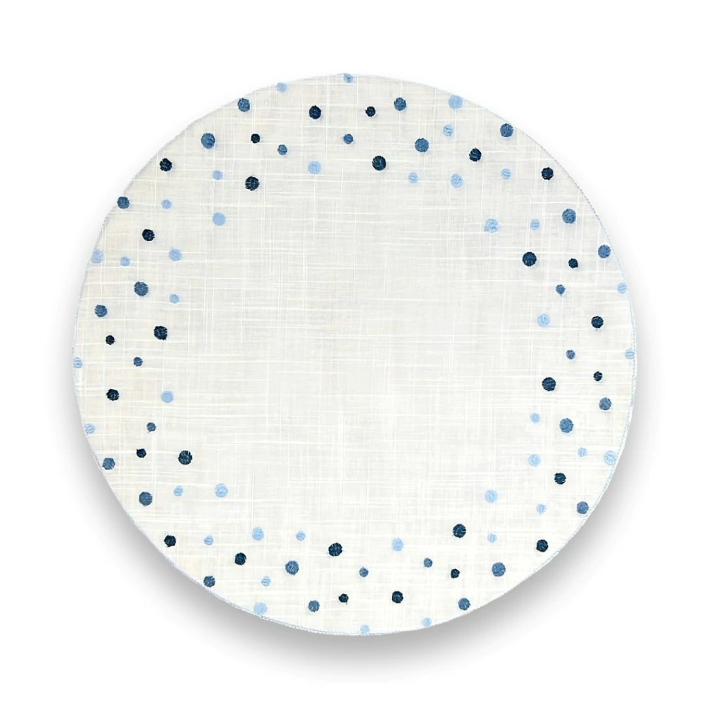 O Jogo Americano Bubbly Branco com Bordado Azul Auguri Casa une delicadeza e sofisticação, com bordado rosa suave que contrasta elegantemente com o fundo branco e valoriza a mesa.