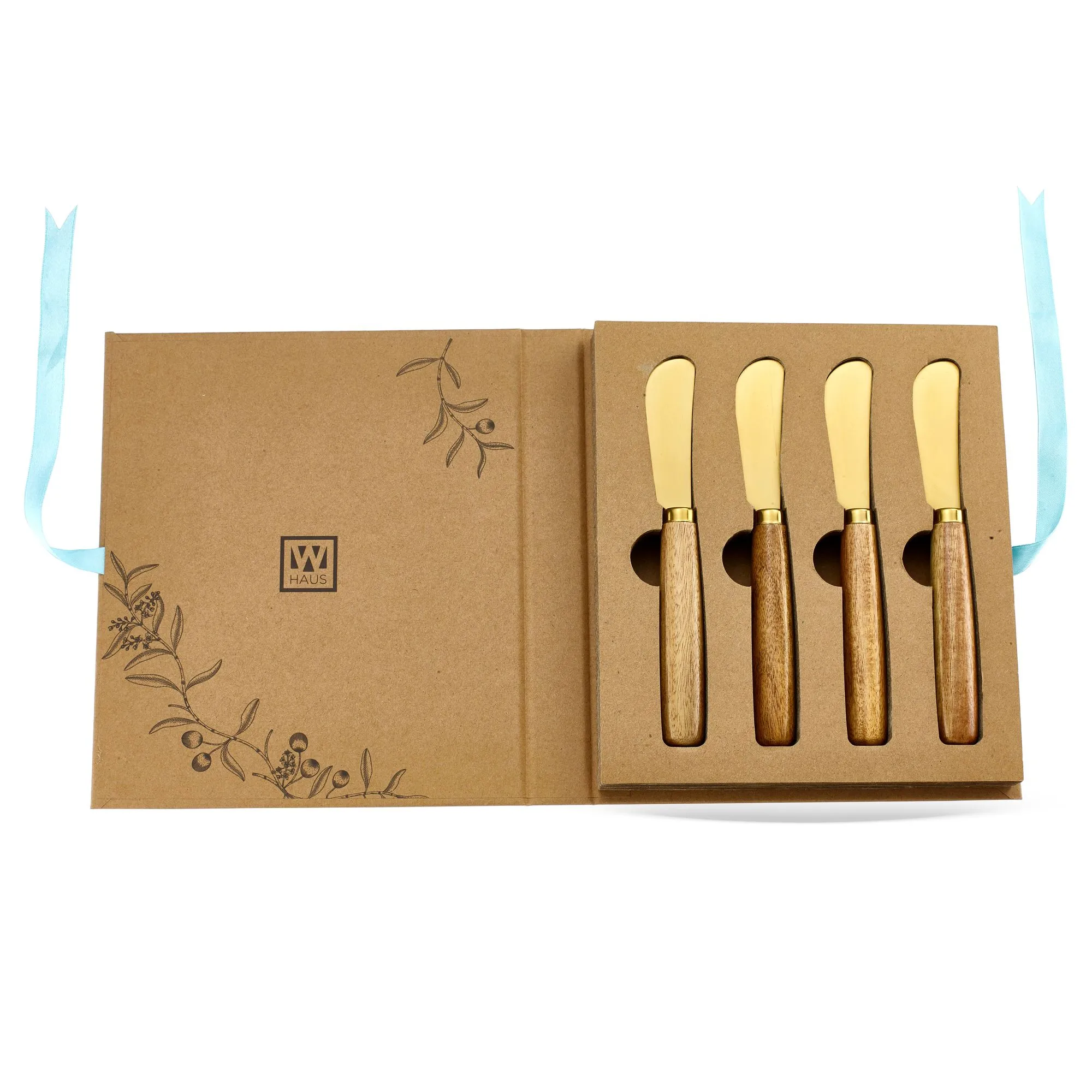 Kit de Espátulas para Queijo Atmosfera BTC Decor - com 4 peças em aço inox dourado e cabos em madeira, combina durabilidade, elegância e sofisticação para servir seus queijos com estilo e praticidade.