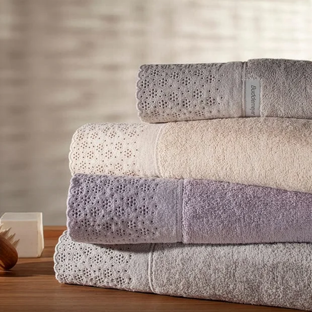 Toalha Lovely de estética delicada e sofisticada, com barra aveludada, aplicação de bordado inglês floral e acabamento scalloped, que traduzem elegância e requinte decorativo.