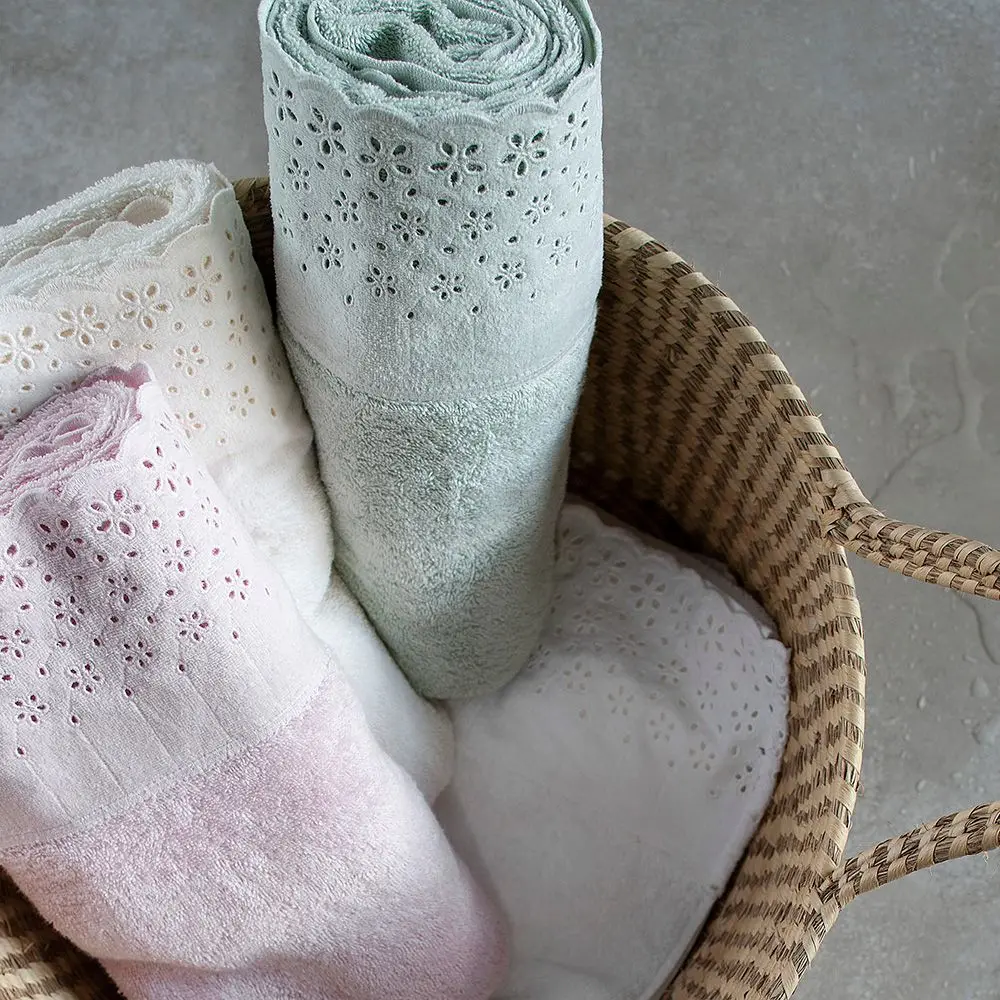 A linha Crystal possui linda aplicação de bordado inglês na sua barra, a renda bordada com veludo dá ainda mais elegância e charme para a toalha. Acabamento especial Buddemeyer, que proporciona alta capacidade de absorção e maciez.